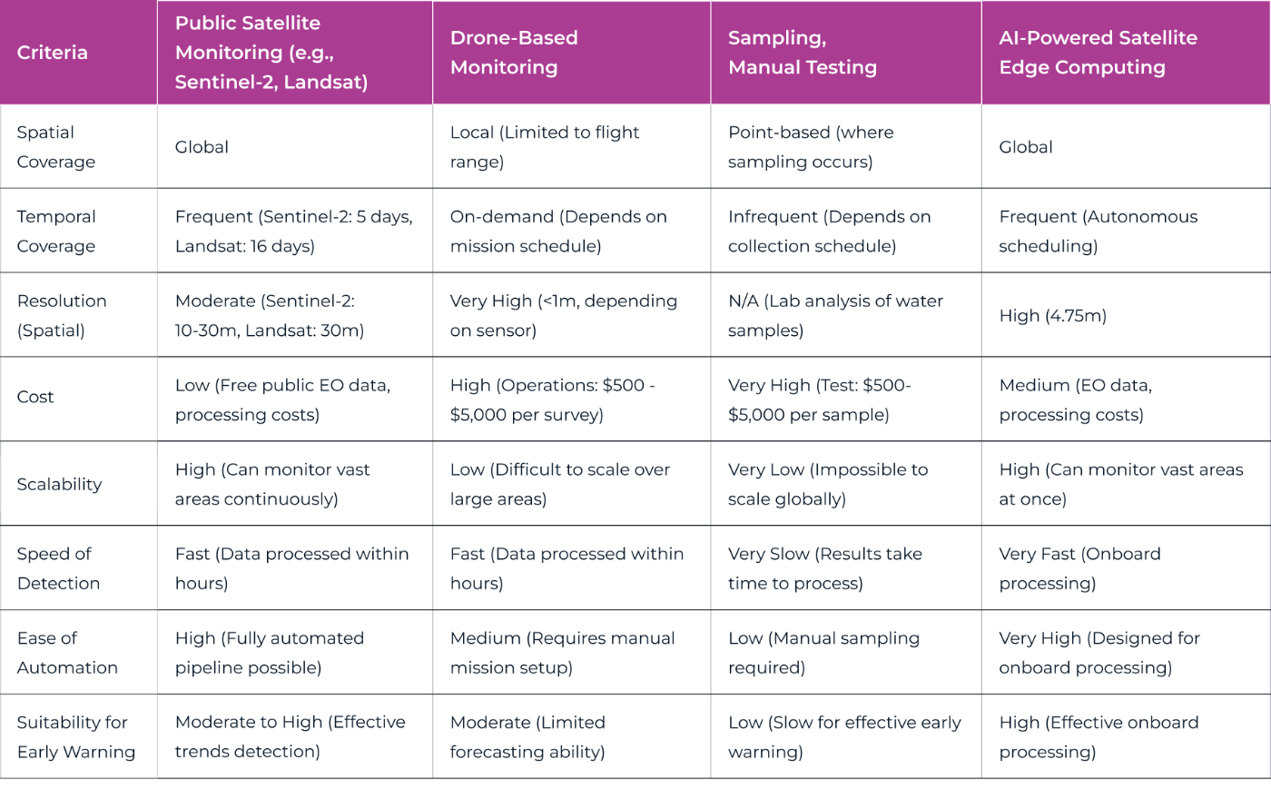 Despite the immense potential of EO, current spectral and threshold-based approaches face significant challenges in accurately differentiating HABs from other water anomalies. These can include sediment plumes, cloud reflections, and natural water color variations, often leading to misclassifications.