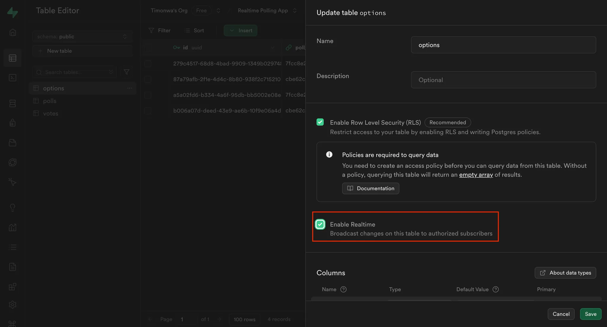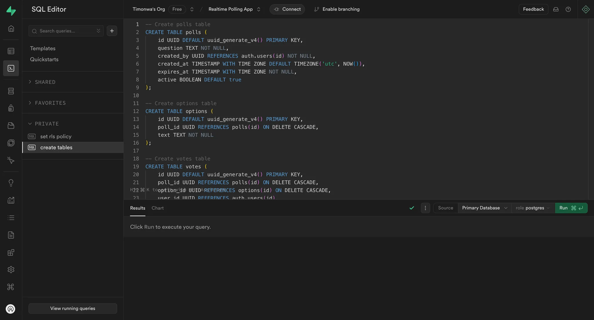 This app uses three main tables: polls, options, and votes. Use the SQL Editor in the Supabase dashboard and run the following: