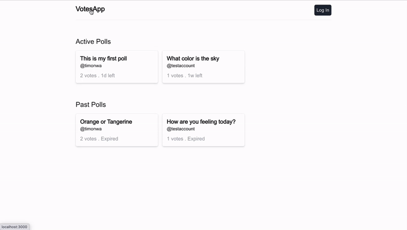 You should be able to see the application’s changes by going to the browser. On the home screen, users can view the list of active and past polls, whether they are logged in or not. However, when they click on a poll, they will not be able to view the poll details or vote on it. Instead, they will be prompted to log in.