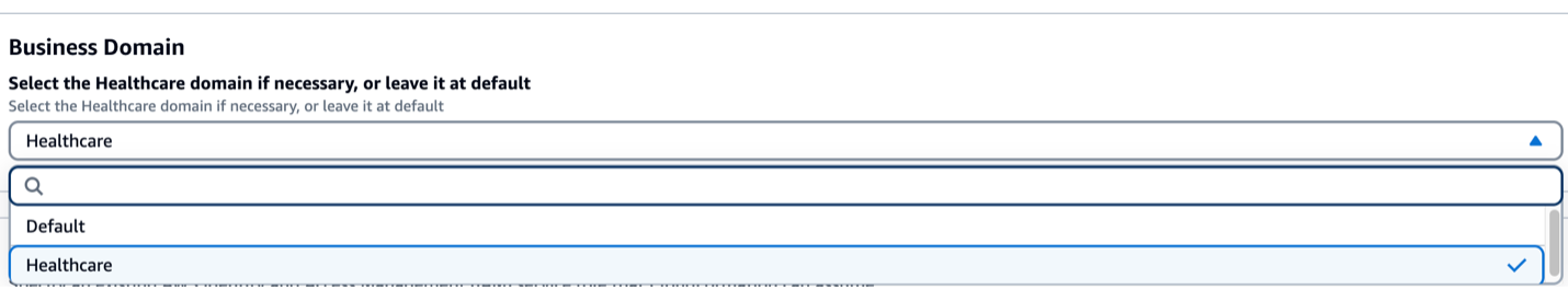 Follow the instructions in Deploy the solution using AWS CloudFormation in this LMA blog post to start deploying the solution. To deploy the LMA for healthcare, select Healthcare from the dropdown menu as your domain.
