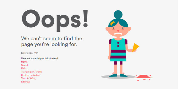 Airbnb’s error page shows an animation of a little girl dropping ice cream—a universal symbol of disappointment—while providing helpful links to popular destinations, search functionality, and customer support options.
