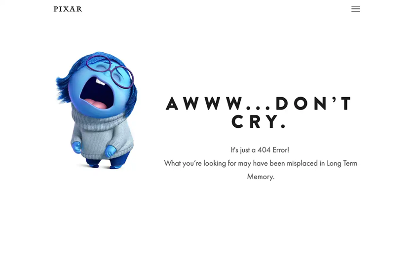 Pixar cleverly uses characters from “Inside Out” on their error page, showing the character Sadness looking at a broken page. This not only reinforces their brand but creates an emotional connection through their own intellectual property.