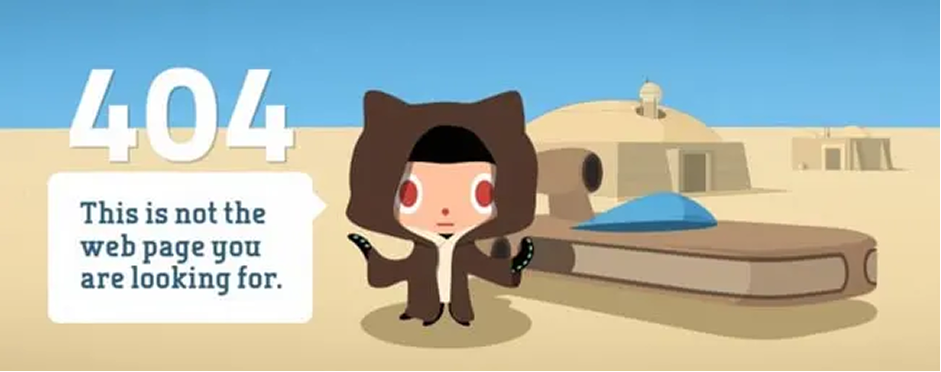 GitHub transformed their 404 page into an engaging Star Wars reference with a search droid and “This is not the web page you are looking for” message—a clever nod to the famous Obi-Wan Kenobi line while maintaining their tech-forward brand identity.