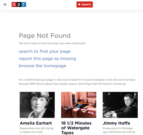 Instead of showing a standard error page, NPR redirects users to archived stories and popular content. This strategy maintains engagement by immediately offering valuable alternatives.