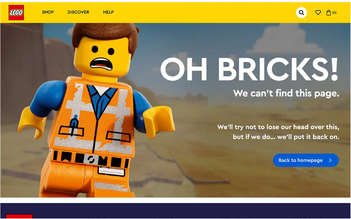 Lego’s error page perfectly aligns with their product with the message: “We’ll try not to lose our heads over this, but if we do… we’ll put it back on.” This is accompanied by an animation of a Lego figure whose head pops off and back on—turning a potential frustration point into a brand-reinforcing moment.