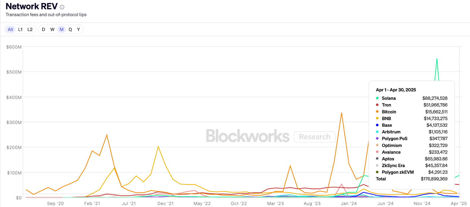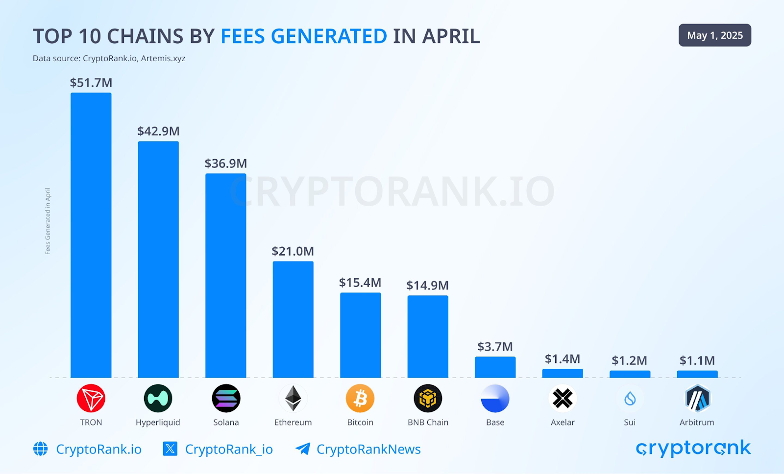 Ethereum also slipped behind Solana and Tron in on-chain revenue generation in April.