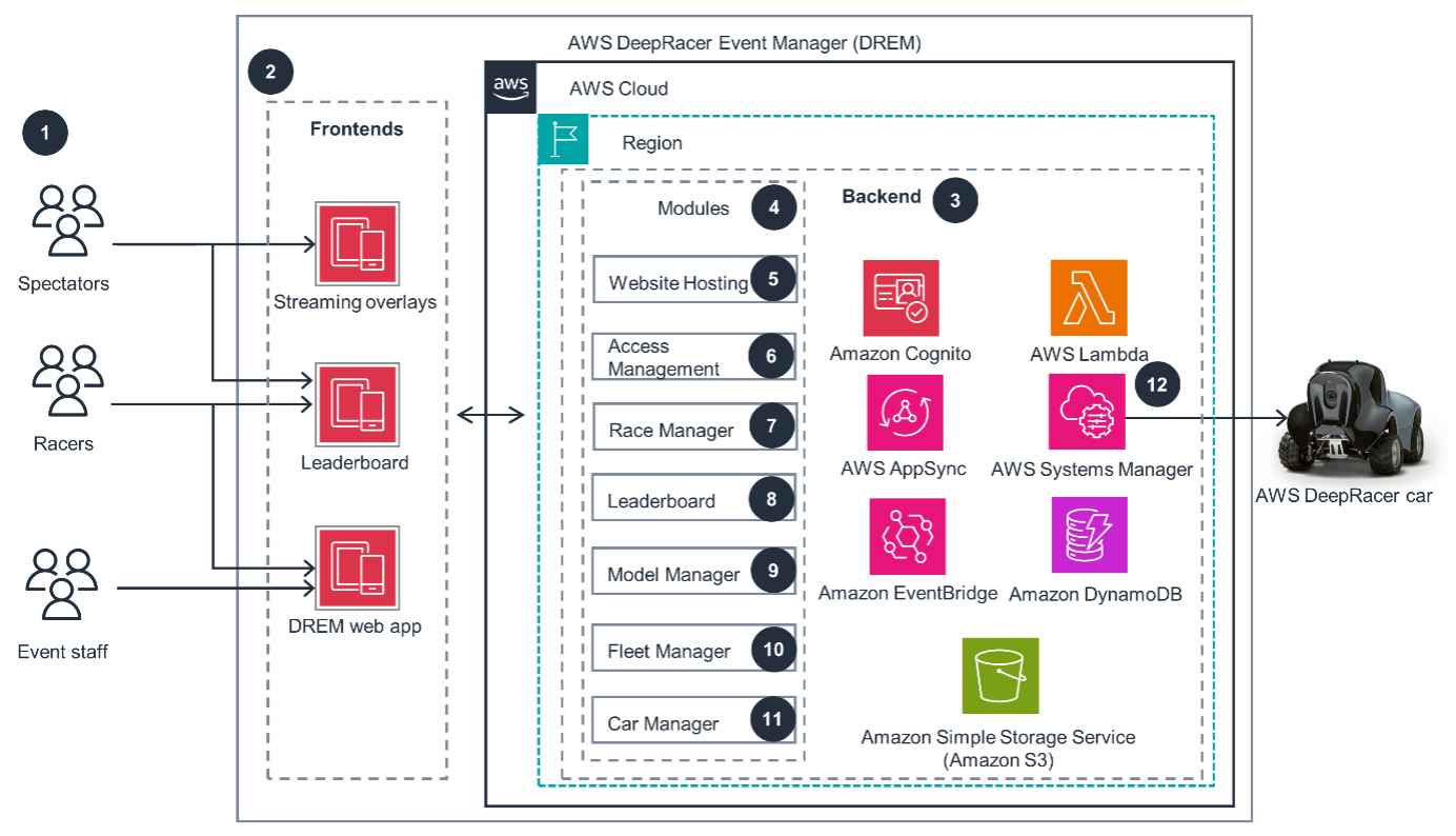 AWS DeepRacer Event Manager is an innovative application that Eviden has deployed within its own AWS environment. Comprised of AWS Cloud-centered services, DREM is designed to simplify the process of hosting in-person AWS DeepRacer events, while also delivering a more engaging and immersive experience for both participants and spectators.