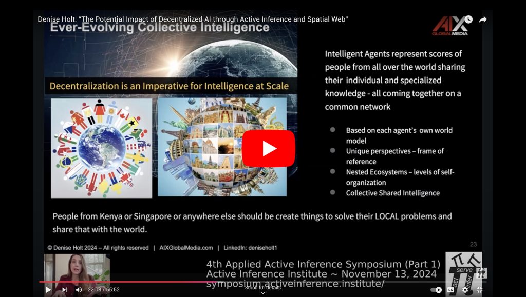 The symposium underscored the transformative potential of Active Inference across various domains. My presentation highlighted the critical role of the Spatial Web and decentralized AI in shaping the future of intelligence at scale through Active Inference. These technologies hold the potential to enable unprecedented levels of interoperability, scalability, and context-aware computing.