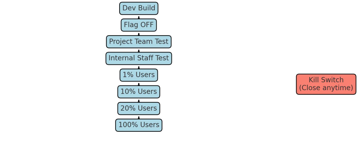 A feature flag means you deploy code live, but do not show it to all users. You control who sees it: maybe only your team, maybe a small test group, or maybe 10% of users. If something goes wrong, you can close the feature fast, without waiting for a new app release.