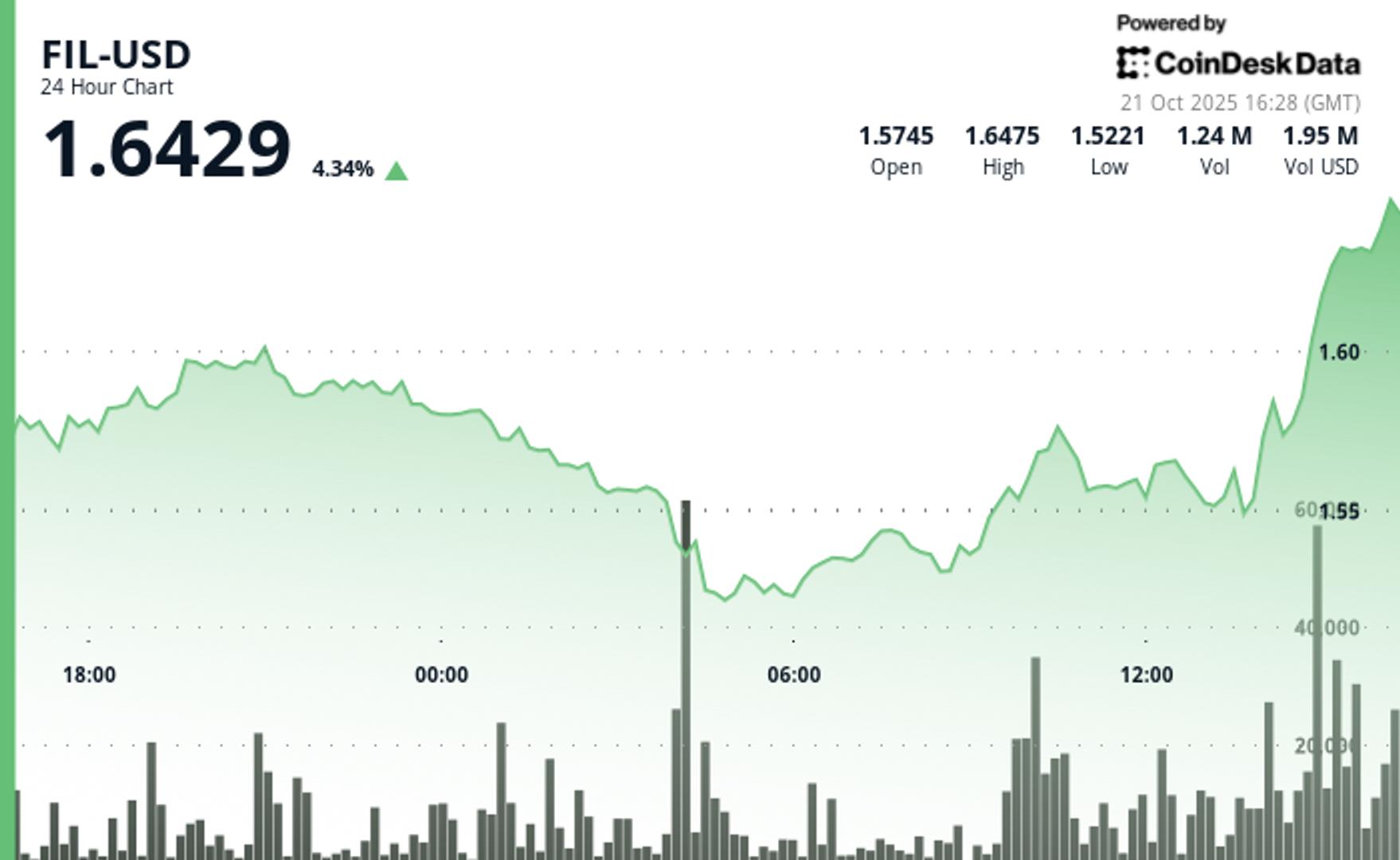 Filecoin Jumps More Than 4% After Retaking $1.60 Resistance Level October 21, 2025 by kamal The token has support at the $1.52 level and resistance at $1.65.