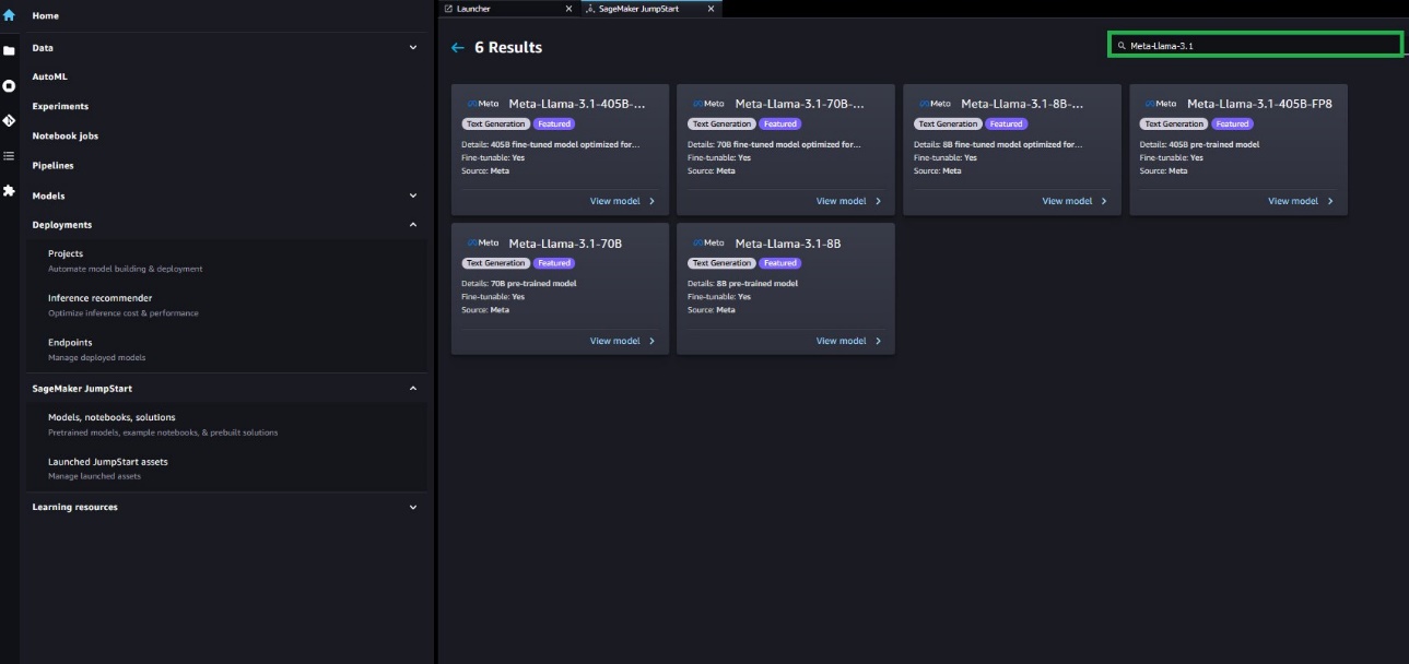 In SageMaker Studio, you can access Meta Llama 3.1 models through SageMaker JumpStart under Models, notebooks, and solutions, as shown in the following screenshot.