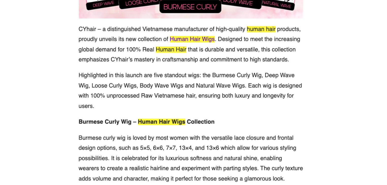 Whenever it made sense, I included links, visuals, or videos. For example, in this press release, I included images of CYhair Vietnam’s premium human hair wigs to showcase their features and quality.