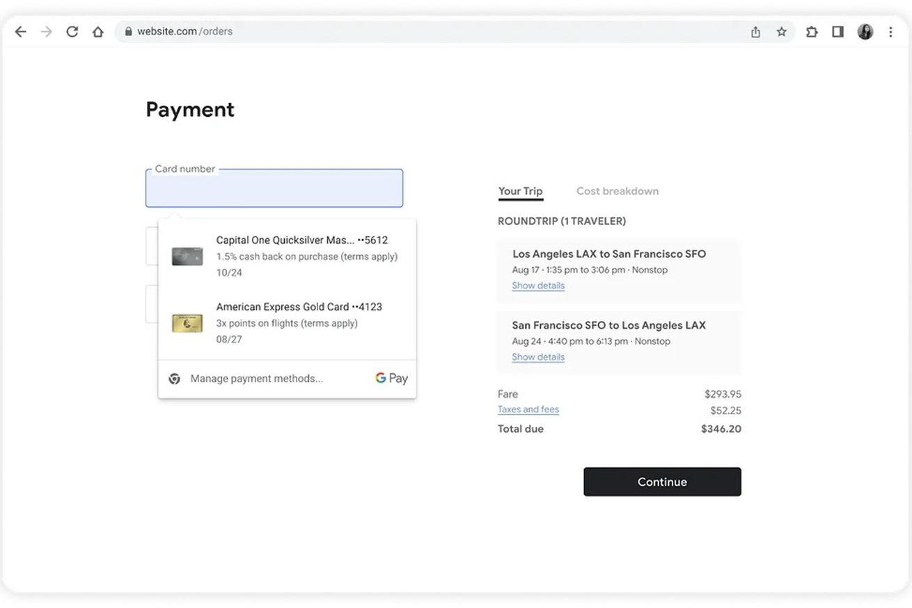 You can see the benefits during checkout when prompted to enter a card number. A drop-down menu appears showing your card options along with a new description of benefits, like the percentage of cash back you get or what your point multiplier is for certain categories like travel. For now, this feature is only available when using Chrome on the desktop.