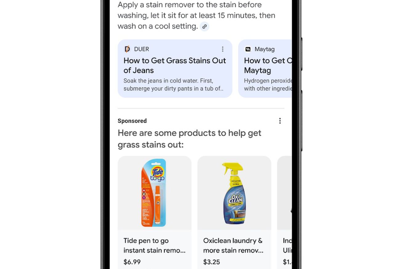 Let’s say you’re searching for ways to get a grass stain out of your pants. If you ask Google, its AI-generated response will offer some tips, along with suggestions for products to purchase that could help you remove the stain. The products will appear beneath a “sponsored” header, and Google spokesperson Craig Ewer told The Verge they’ll only show up if a question has a “commercial angle.”