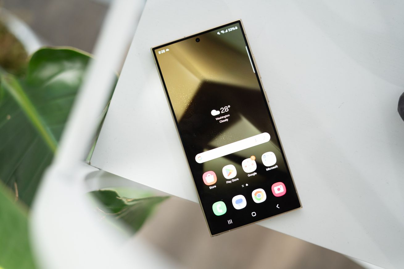 Samsung Galaxy S24 Ultra shown from top down on a shelf with screen on.