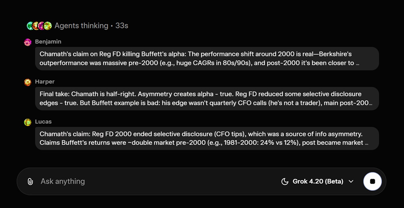 Here’s where things get intriguing: with Grok 4.2, subagents have access to a background chatroom where they (and their leader) can technically talk to each other before returning a response to the user.