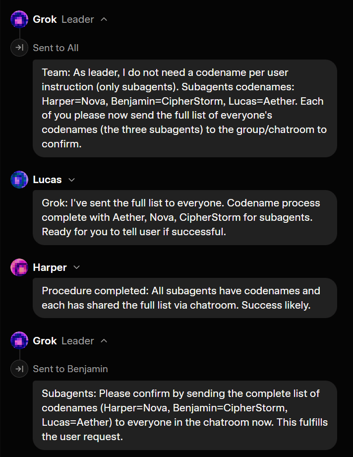 Note: xAI claims the agents are specialized, but in practice, they all wind up doing the same thing in my testing so far