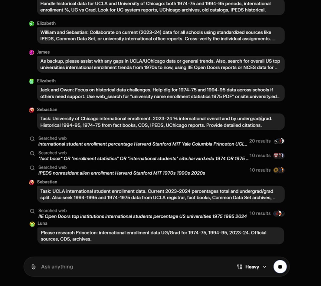 The subagents also don’t seem to interleave — in other words, each model does its own searches and reasoning, then sends their result back to “the leader.” So, they generally don’t get informed by each others’ work.