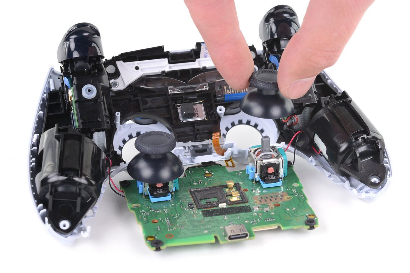 I suspect GuliKit’s gamepad sticks will require soldering, though… this DualSense, for example, has sticks soldered to the board. | Image: iFixit