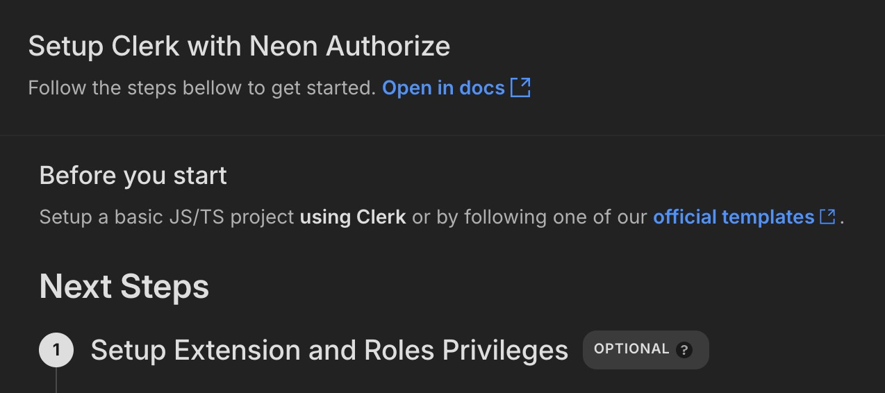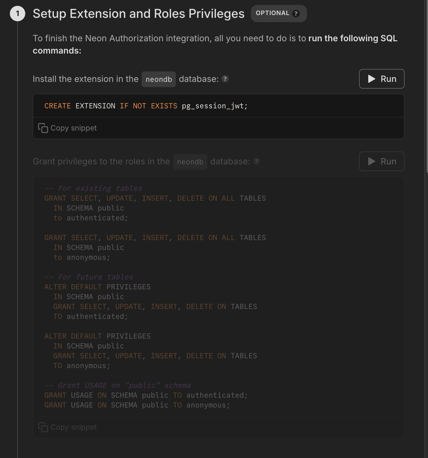 1. Set up Neon Extension and Roles Privileges. Run these steps in the Dashboard.