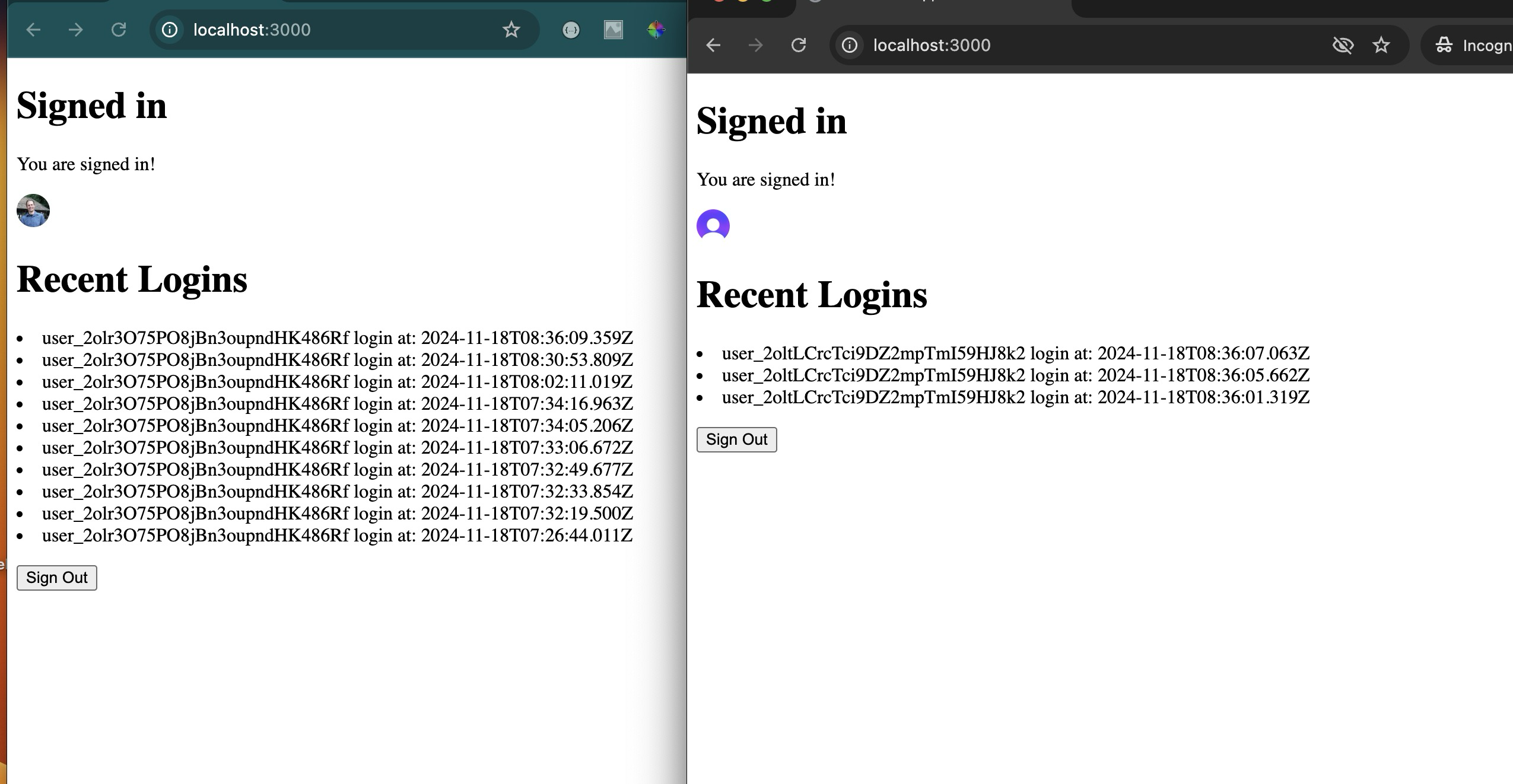 , which contains the last 10 login entries. This response builds a page that tells the user that they are signed in, lists their last 10 logins, and shows a Sign Out button as shown below: