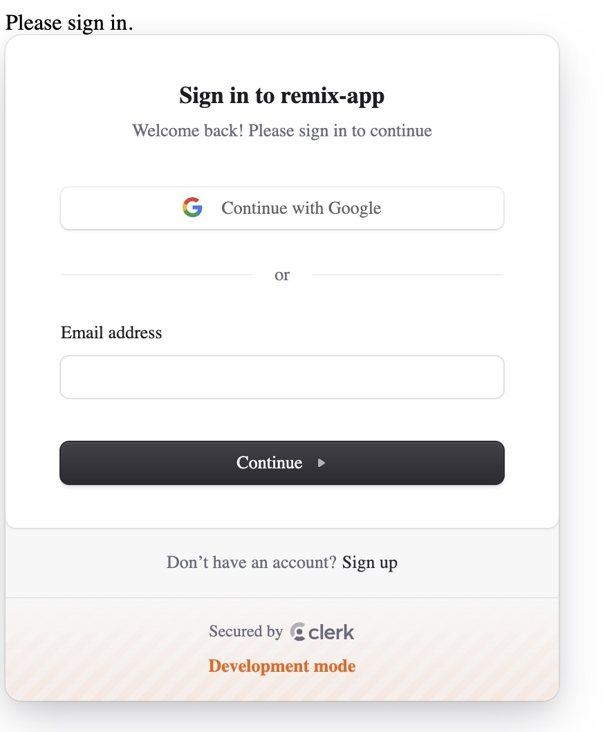 page. The sign-in page can be configured in the Clerk dashboard to accept different login types, such as Google and email logins:
