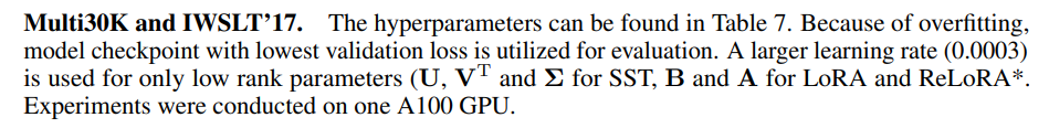 The hyperparameters for our experiments are detailed in Table 8. We employ a linear warmup of 2000 steps followed by a stable learning rate, without decay. A larger learning rate (0.001) is used for only low rank parameters (U, VT and Σ for SST, B and A for LoRA and ReLoRA*. The total training tokens for each experiment is 19.7B, roughly 2 epochs of OpenWebText. Distributed training is facilitated using the Accelerate [55] library across four A100 GPUs on a Linux server.