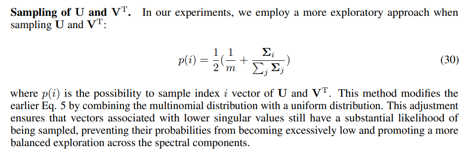 For SST, number of steps per iteration (T3) is set to 200 for Multi30K and 400 for IWSLT’17. Each iteration begins with a warmup phase lasting 20 steps. The number of iterations per round (T2) is determined by the formula T2 = d/r, where d represents the embedding dimension and r denotes the rank used in SST