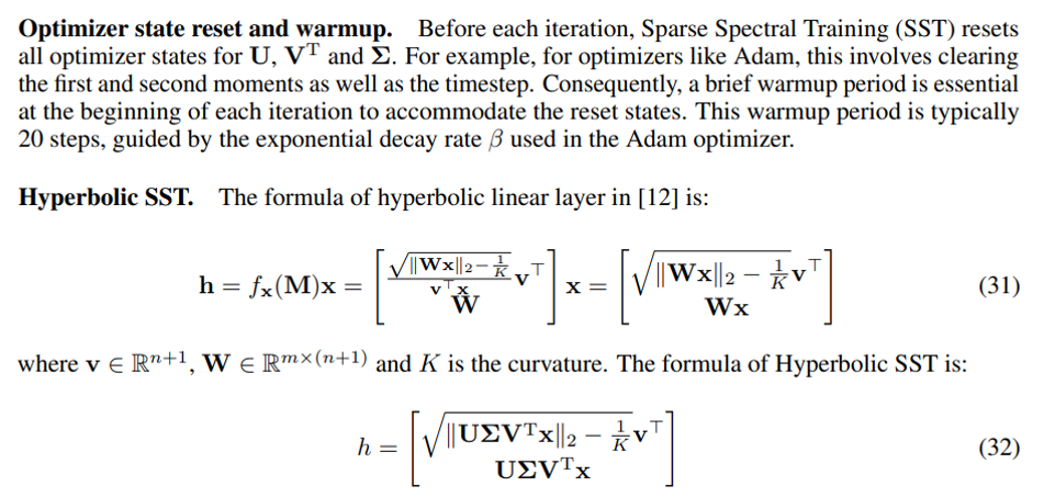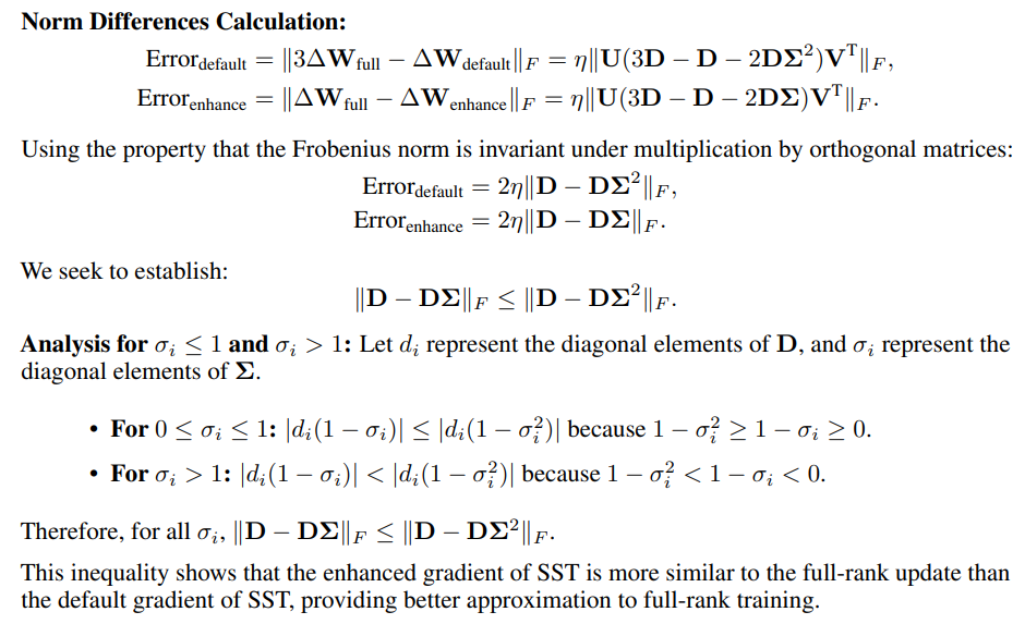 For SST, number of steps per iteration (T3) is set to 100. Each iteration begins with a warmup phase lasting 100 steps. The number of iterations per round (T2) is determined by the formula T2 = d/r, where d represents the embedding dimension and r denotes the rank used in SST.