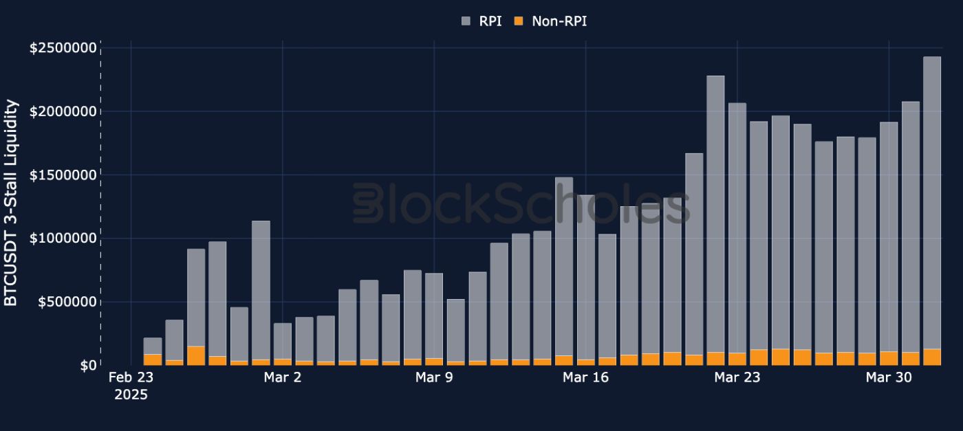 Technical indicators tracked during this period included 3-stall liquidity measurements, a metric that evaluates available depth across three price levels. Block Scholes’ analysis shows RPI orders consistently improved liquidity at these levels.