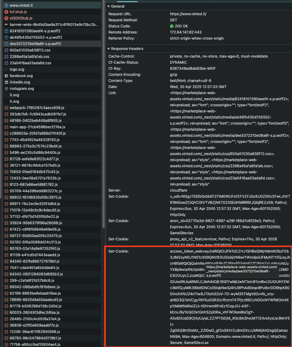 In the Vinted case, the token seems to be generated on the flight in the backend: from the first calls, both on mobile and on the website, we see the tokens in the headers or in the cookies (in case of the website).