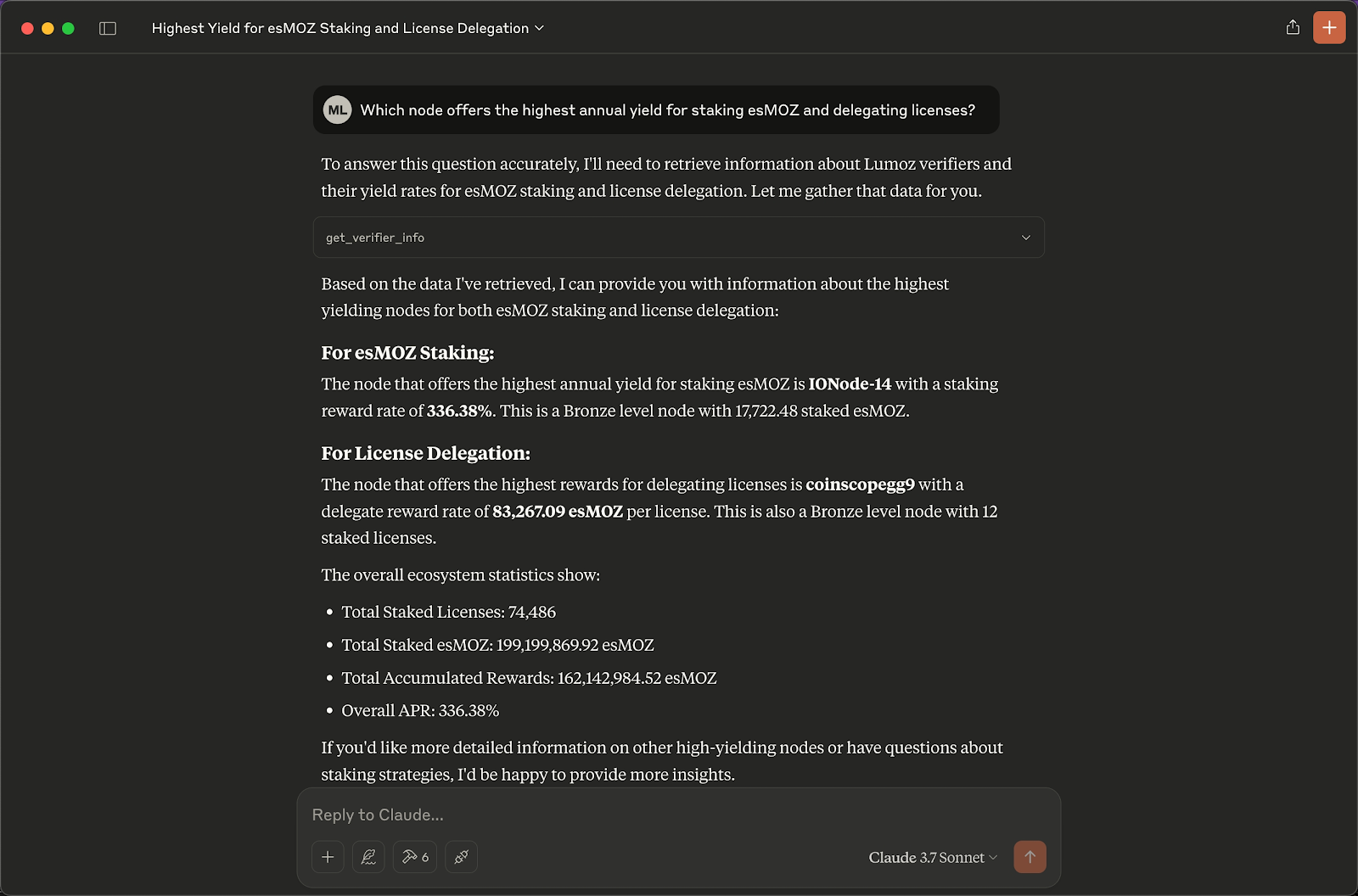 Developed using the standard MCP protocol, Lumoz MCP allows users to interact with Lumoz network smart contracts and data resources via natural language commands. For example, users can query Lumoz Chain asset balances, view verifiable node data, and access other Lumoz Chain-related information. This functionality benefits from Lumoz’s high-performance computational capabilities and the standardized interfaces of MCP, providing a stable and open platform for AI Agents in Web3 applications. Users can experience this functionality through Claude Desktop.