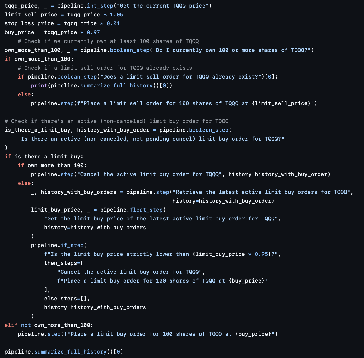 As you can see with the example each step is atomic, self sufficient. It has a predictable final type (boolean/float/etc). As a result, in our experiments, the same task on the same agent on the same model went from <50% success rate (of full pipeline execution end to end) when done via one mega prompt to 99+% success rate when executed in the shape of a proper pipeline.