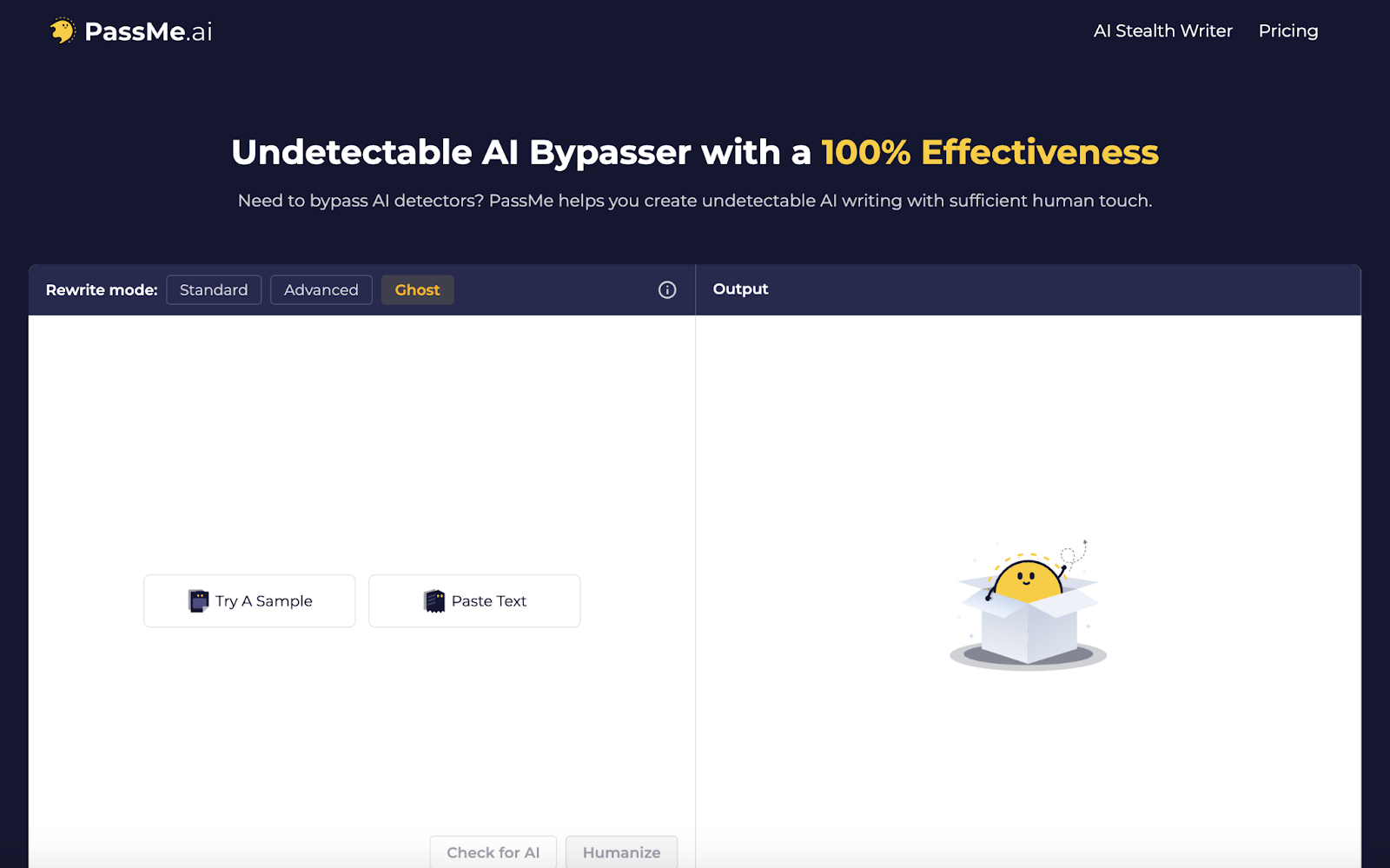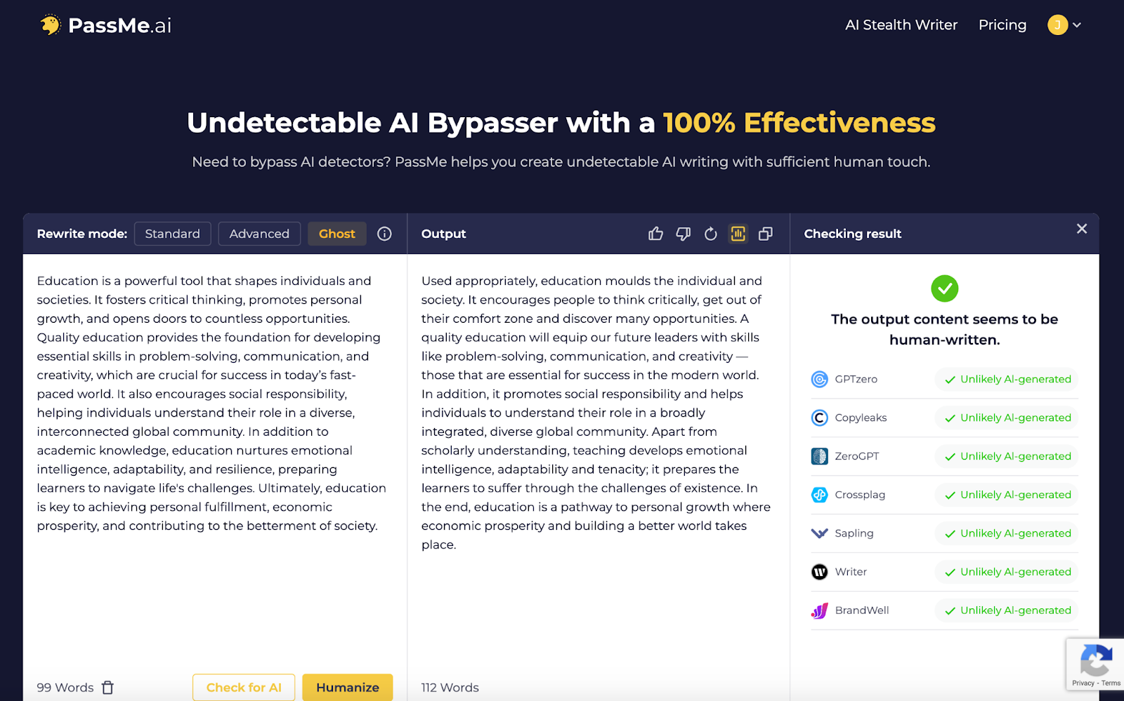 PassMe.ai is an advanced AI stealth writer that is extensively trained to spot the common writing patterns of text used by LLMs like GPT4, Gemini, Claude, ChatGPT, etc. It then reworks and restructures the content to sound more human-like, which enables it to bypass AI detection with excellent readability.