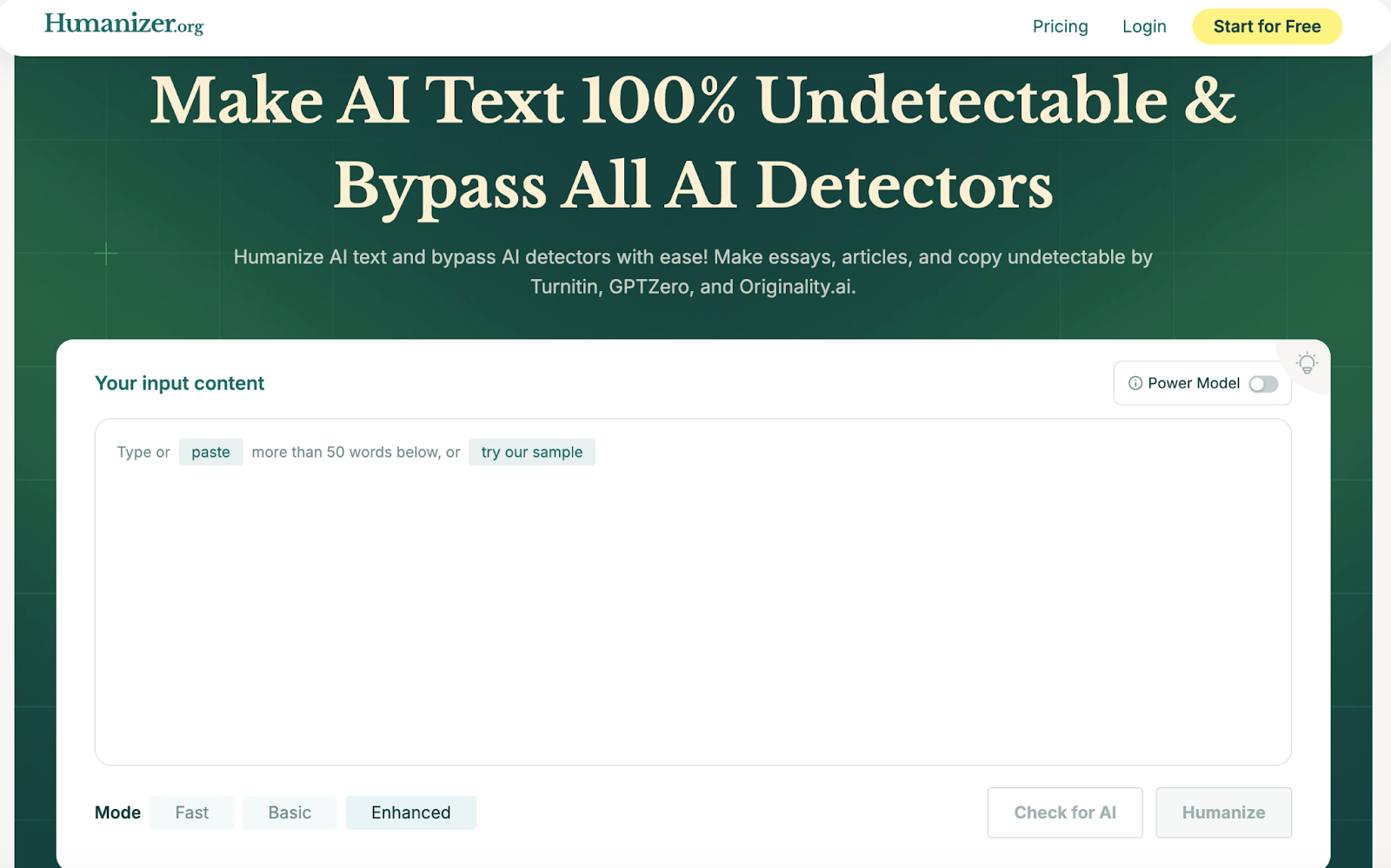Another highlight of this tool is its unique Power Model, which is guaranteed to help you bypass advanced AI detectors like Originality and Turnitin without fail. Furthermore, Humanizer.org works well for various use cases. It can be utilized by students, marketers, content creators or business professionals looking to bypass AI content detection.