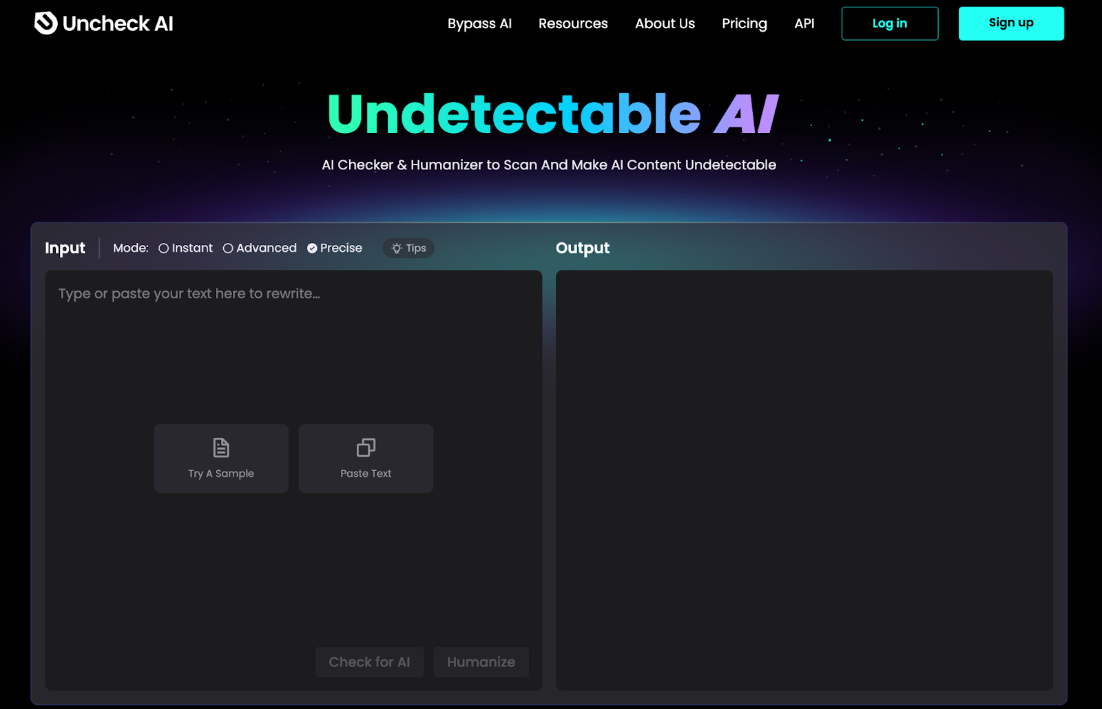 Uncheck AI provides users with access to multiple AI bypass modes that will produce different content outputs to choose from. This can be useful to those who may need multiple versions of the same content. You can choose between Instant, Advanced, and Precise modes with each one ensuring the output is still true to the original meaning.