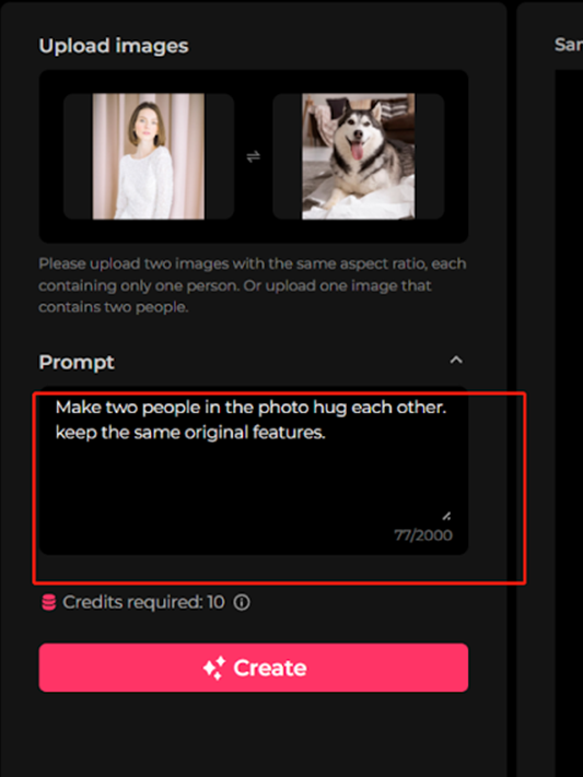 Step 3: Click on ‘Create’ to start the generation process. Normally it takes 10 credits to generate the AI hugging video. Within minutes, the tool will generate an AI hug video. You can also find the final output in the ‘My Creations’ section.