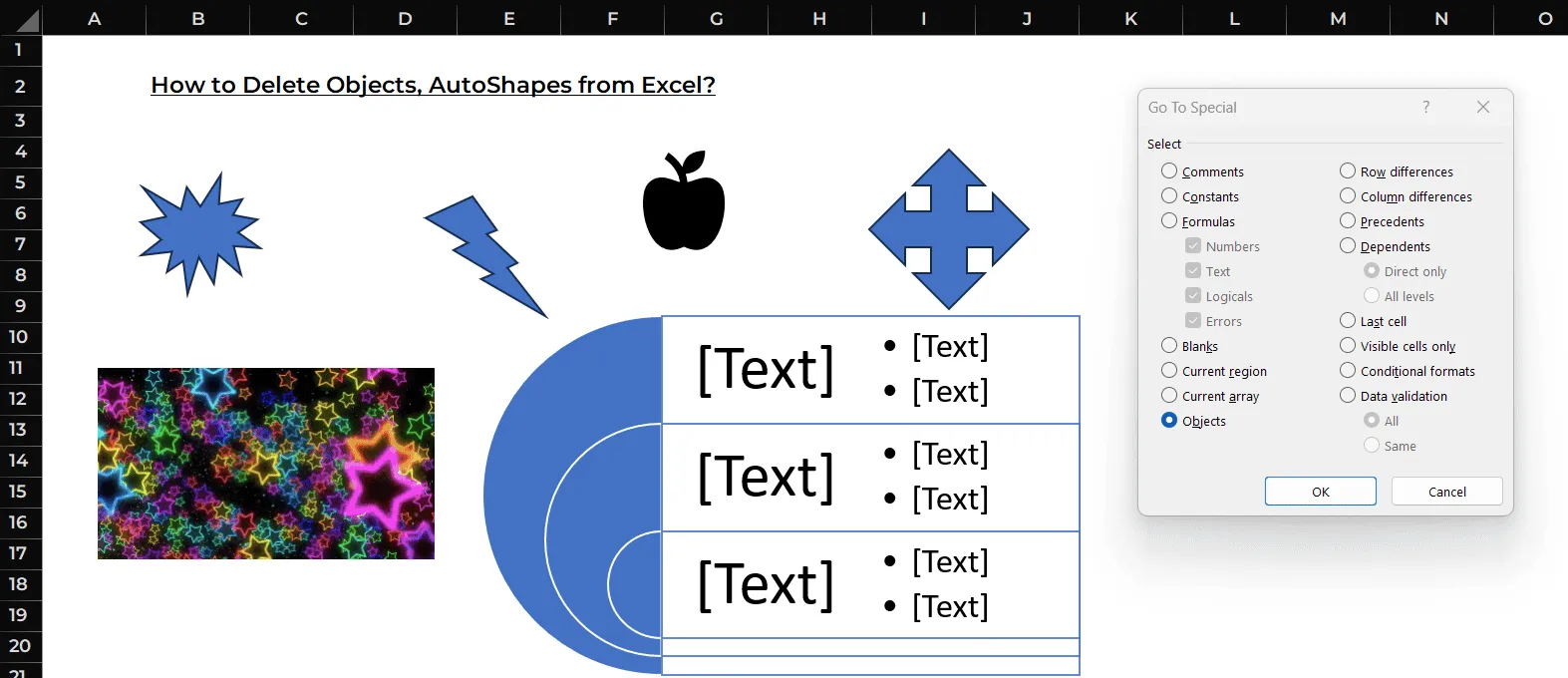 Too many objects cluttering your Excel sheets? It’s easy to clear all objects and autoshapes from your worksheet using the Go To dialog box and a bit of VBA code. In this tutorial, I’ll show you how to instantly delete all objects and autoshapes from your worksheets in Excel.