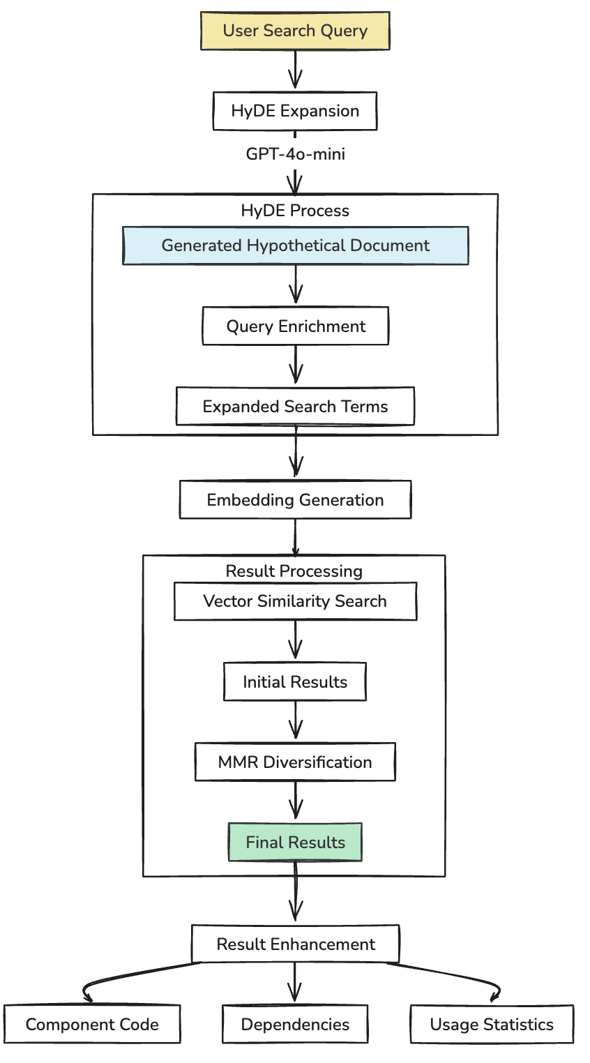 This architecture allows us to efficiently generate, store, and query vector embeddings of UI components, creating a semantic search experience that understands developer intent rather than just matching keywords.
