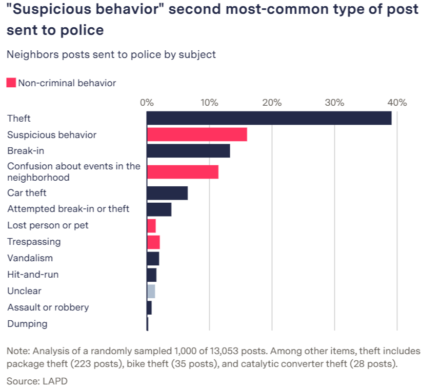 Our analysis of a random sample of Neighbors posts found that over 30 percent of the posts the LAPD received did not describe criminal activity, even if users classified them as “crime.” The content of these posts often included behavior residents deemed suspicious, such as someone “‘checking cars.” Moreover, according to emails between Neighbors employees and the LAPD, only posts classified as “crime” were supposed to be forwarded to officers—but this did not always happen. Dorini, for example, classified his posts that landed in officers’ inboxes under “safety.”