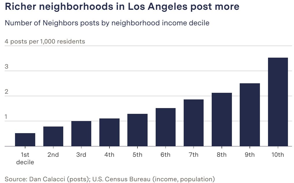 When The Markup further analyzed Neighbors posts published in 2019 in Los Angeles, we found an even clearer trend: Richer areas of the city posted roughly six times more on Neighbors than poorer areas.