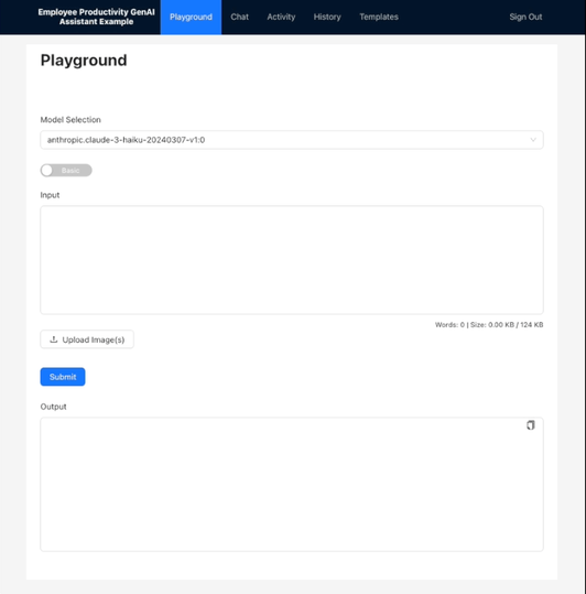The Playground page of the Employee Productivity GenAI Assistant Example is designed to interact with Anthropic’s Claude language models on Amazon Bedrock. In this example, we explore how to use the Playground feature to request a poem about New York City, with the model’s response dynamically streamed back to the user.