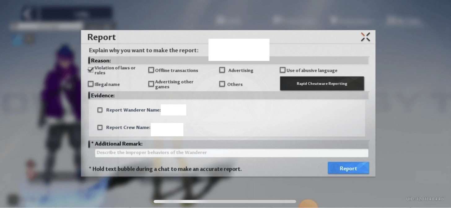 This is a screenshot from Tower of Fantasy, a 3D-action role-playing game. Players can use this dialog to file a report against another player for various reasons. If you were to use a typical CRUD system for it, how would you keep those records for follow-ups? And what are the potential problems?