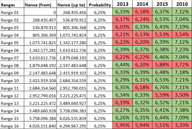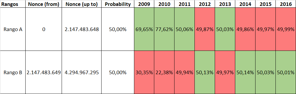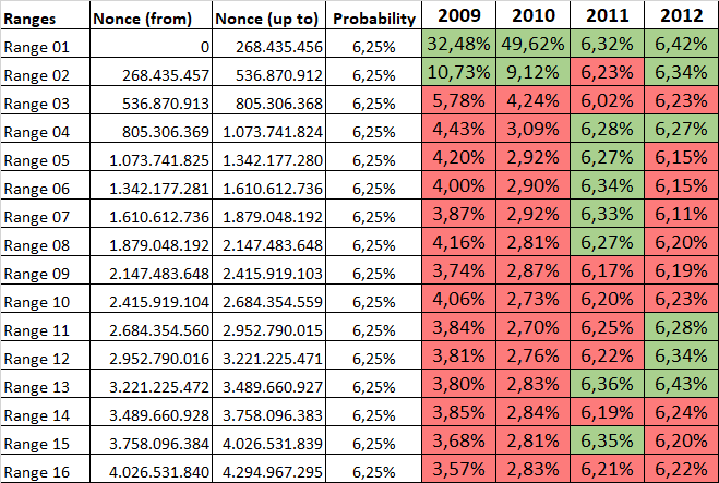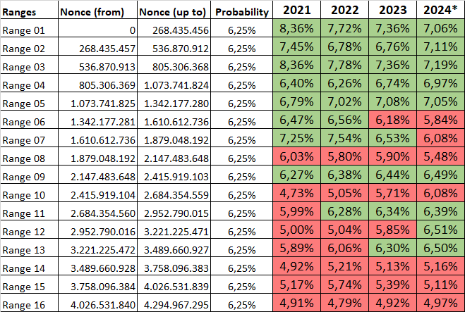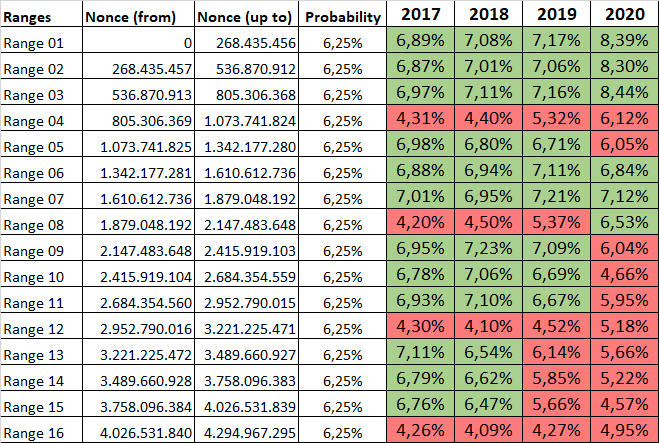 In the provided tables, specific patterns can be observed at a glance through the use of color. The 6.25% probability should remain relatively constant if there are no biases in the generation of nonce values. However, the data shows significant variations, especially in the early ranges, such as Range 01, where the actual probability consistently exceeded the theoretical value, ==peaking at 49.62% in 2010==. This indicates a clear preference for low nonce values in the early years.