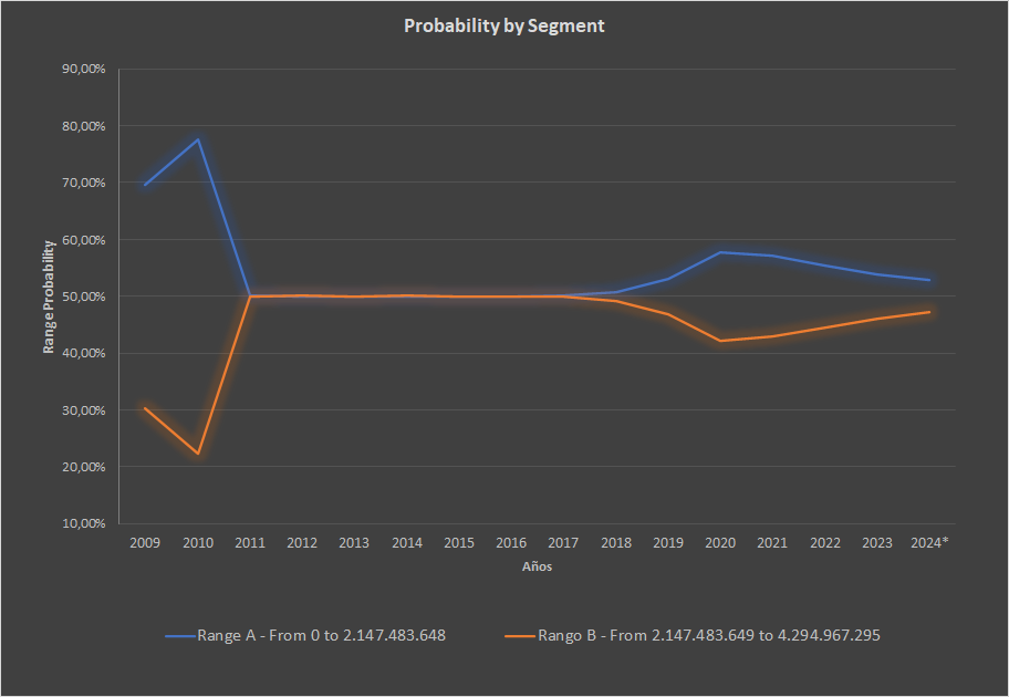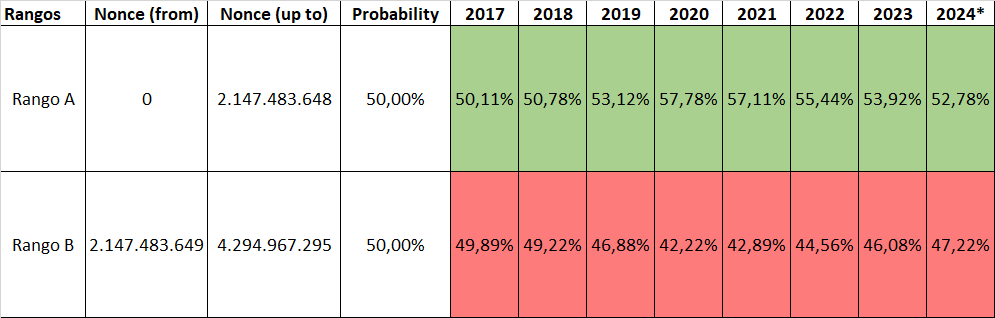 It is evident that, in addition to the earlier periods (as analyzed previously), in the last 7 years there has been a persistent trend towards the appearance of the “winning” nonce in the first range, i.e., within the first 2,147,483,648 values. This preference is particularly notable, as the theoretical probability for both ranges should be 50%. However, the data shows that during this period, the lower range has had a higher incidence, consistently surpassing the theoretical mark.