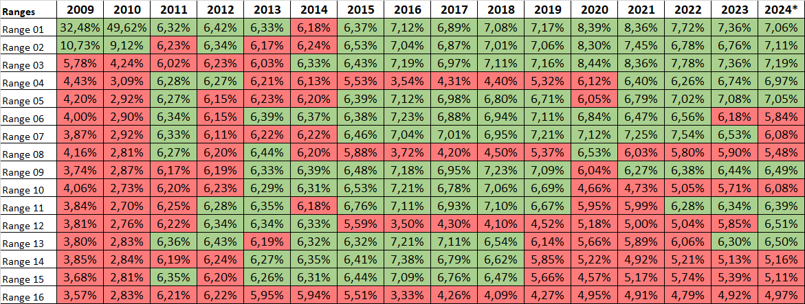 However, when observing the data, we notice some deviations from this expected probability. To make the analysis easier, the cases where the percentage exceeds 6.25% are marked in green, and where it is equal to or less than this value, they are marked in red, from the first block to block 867,366: