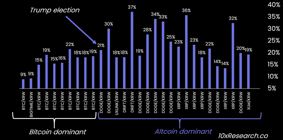 “Since the Nov. 5 Trump election, bitcoin’s dominance as the crypto with the highest volume has been replaced by altcoins, such as Doge, Ripple, and Stellar (XLM 19% market share on UPbit on Sunday, number 1 coin traded). Those are the ones with +100% returns, and while simply monitoring those changes in activity would have resulted in a lot of alpha, as we have frequently pointed out,” Markus Thielen, founder of 10x Research, said in a note to clients Monday.
