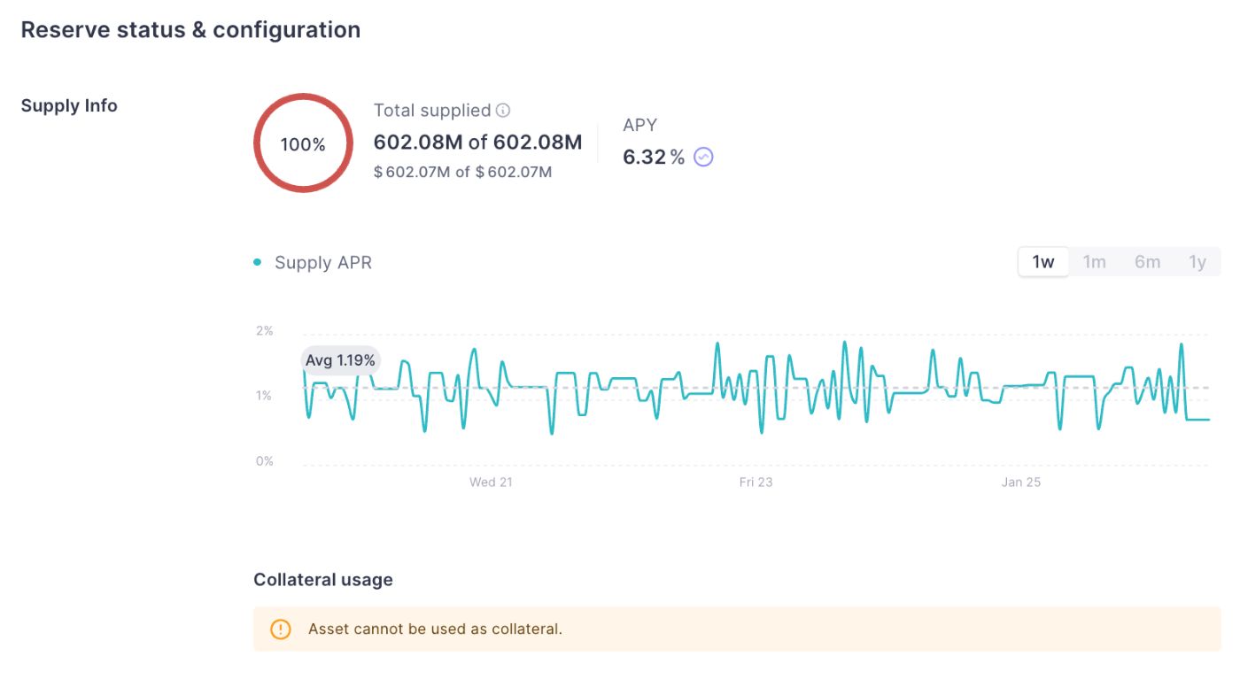 In the example of RLUSD on Aave, the supply cap has already been fully reached, meaning that no additional deposits are currently possible.