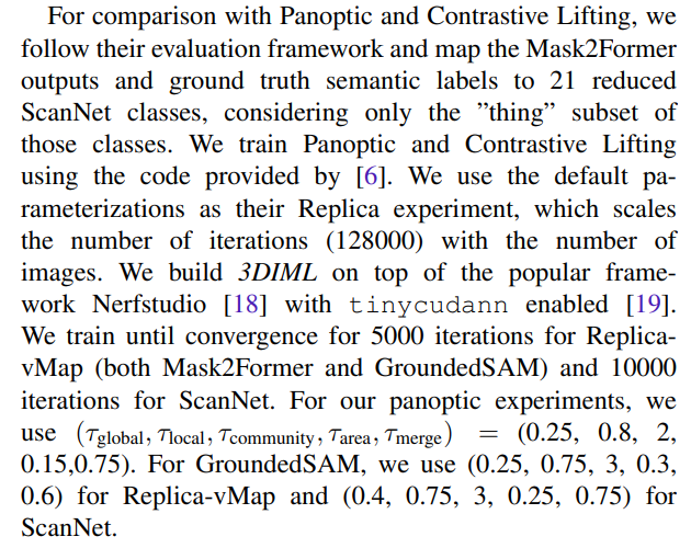 We benchmark our method against Panoptic and Contrastive Lifting using the same Mask2Former frontend. For fairness, we render semantics as in [5], [6] using the same multiresolution hashgrid for semantics and instances. For other experiments, we utilize GroundedSAM as our frontend and FastSAM for runtime performance critical tasks such as label merging and InstanceLoc.