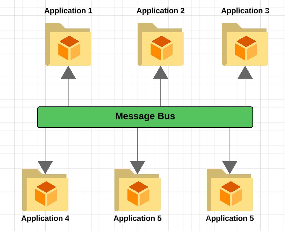 A Message Bus architecture is where the endpoints contain the logic instead of the Broker (or Bus in this case). The Apps use a shared (common) set of interfaces and are responsible for preparing the message, so it complies with the type of messages the rest of the apps connected to the bus expect.